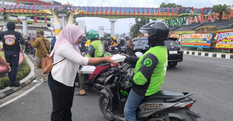 Pembagian dilakukan tepat di bawah Jembatan Penyeberangan Orang (JPO) Siger Milenial atau di pertigaan jalan Pangeran Diponegoro – Hasanudin – Dr Susilo, itu disambut antusias warga Kota Tapis Berseri.