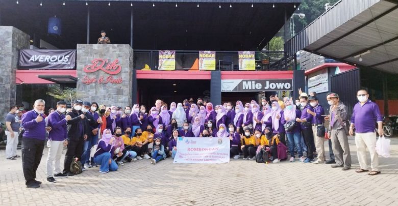 Pegawai di lingkungan Disdikbud Bandar Lampung, mengabadikan momen bersama saat akan berangkat mengikuti Hakordia KPK RI, di Tampia Tour & Travel di Jalan Urip Sumoharjo, Kecamatan Way Halim, Rabu (7/12/2022). ISTIMEWA