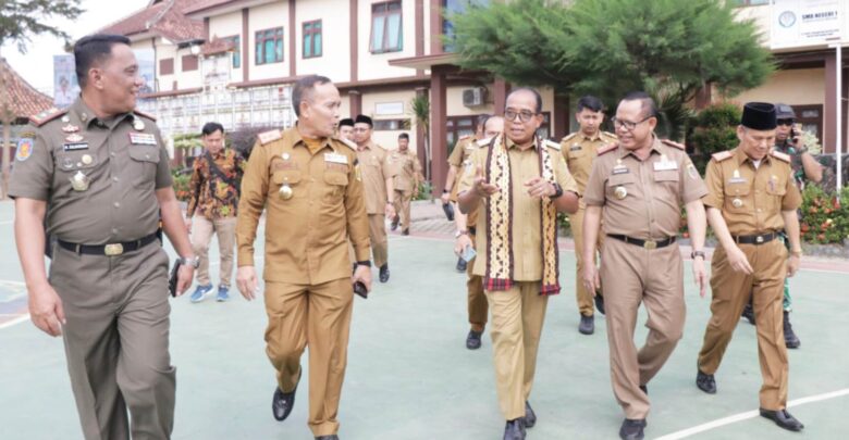 Di SMAN 1 Terbanggi Besar, Pj Samsudin disambut oleh rombongan guru serta jajaran Kepala Sekolah di Kabupaten Lampung Tengah.
