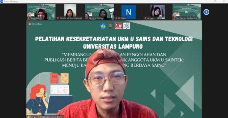 Kegiatan yang digelar secara daring melalui platform Zoom Meeting, Minggu, 18 Februari 2024 ini dibuka Ir. Meizano Ardhi Muhammad, S.T., M.T., selaku Dosen Pembina UKM-U Saintek, dan menghadirkan Penyusun Informasi dan Publikasi Humas Unila, Angelino Vinanti, sebagai pemateri.