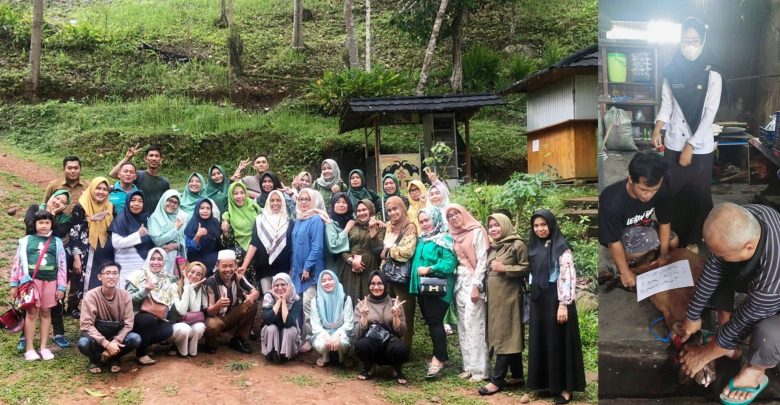 Kiri, 17 Guru PPPK SDN 1 Bandar Lampung mengabadikan momen bersama guru lain, usai mengikuti tasyakuran di Objek Wisata Wira Garden, baru-baru ini. Kanan, Proses penyembelihan hewan kambing sebagai ungkapan syukur diterima sebagai guru PPPK. DOK SEKOLAH