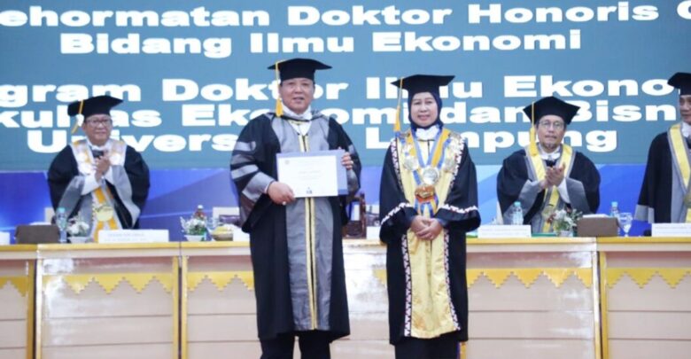 SMARTNEWS.ID – Universitas Lampung (Unila) untuk pertama kalinya menyumbangkan seorang Doktor Honoris Causa (H.C) kepada Negara Republik Indonesia. Gelar Doktor H.C., diberikan Unila kepada Gubernur Lampung Ir. Arinal Djunaidi, dalam Sidang Promosi Doktor Honoris Causa, di Gedung Serbaguna Unila, Kamis, 26 Oktober 2023.