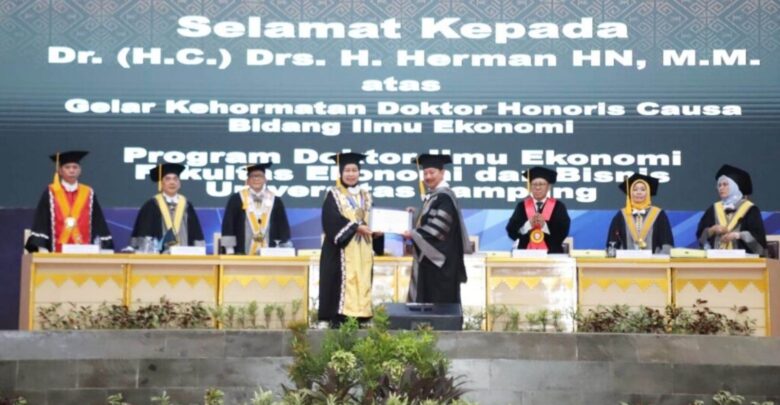 SMARTNEWS.ID – Universitas Lampung (Unila) kembali menghadirkan momen bersejarah dengan penganugerahan gelar Doktor Honoris Causa (H.C.) kepada Drs. Herman Hasanusi, M.M., Wali Kota Bandar Lampung periode 2010-2021. Sidang promosi Doktor Honoris Causa ini digelar di Gedung Serbaguna Unila, Rabu, 1 November 2023.