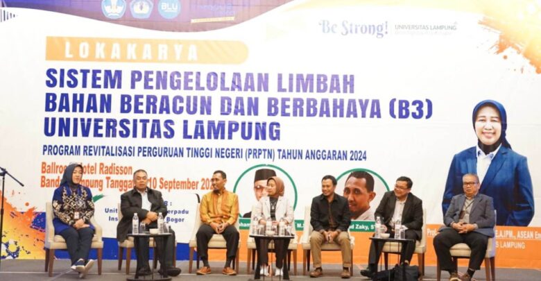 SMARTNEWS.ID – Universitas Lampung (Unila) menggelar Lokakarya Sistem Pengelolaan Limbah Bahan Beracun dan Berbahaya (B3) yang merupakan bagian dari Program Revitalisasi Perguruan Tinggi Negeri (PRPTN) tahun anggaran 2024, di Ballroom Hotel Radisson, Bandar Lampung, pada 9-10 September 2024.