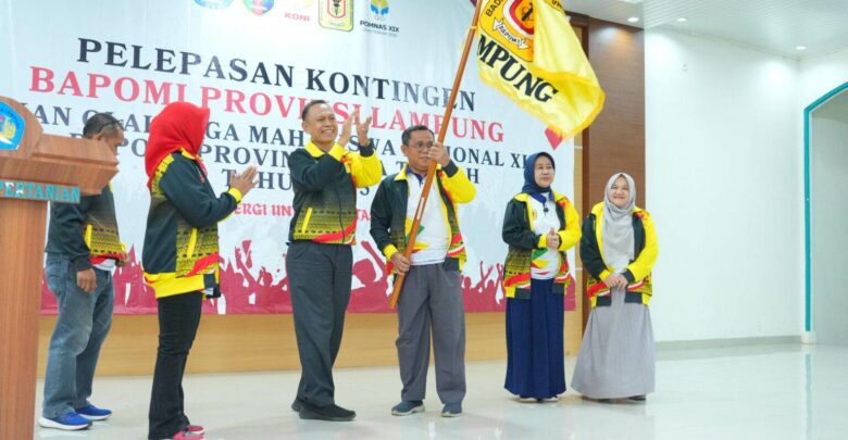 Rektor Unila, Prof. Dr. Ir. Lusmeilia Afriani, D.E.A., IPM., ASEAN Eng., bersama Ketua Bapomi Lampung Prof. Dr. Sunyono dan Ketua Umum KONI Lampung Taufik Hidayat, hadir langsung untuk melepas kontingen. Prosesi pelepasan ditandai dengan penyerahan bendera Bapomi oleh Ketua KONI Lampung kepada Ketua Bapomi Provinsi Lampung, didampingi Ketua Kontingen POMNas 2025.