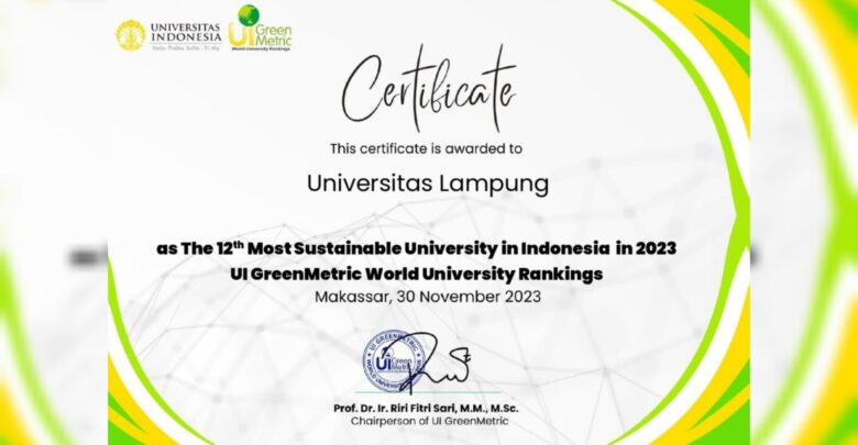 Torehan prestasi ini dibuktikan dengan naiknya peringkat Unila dari tahun lalu dengan menduduki posisi 12 dalam urutan kampus berkelanjutan terbaik di Indonesia tahun 2023 menurut pemeringkatan UI Greenmetric.