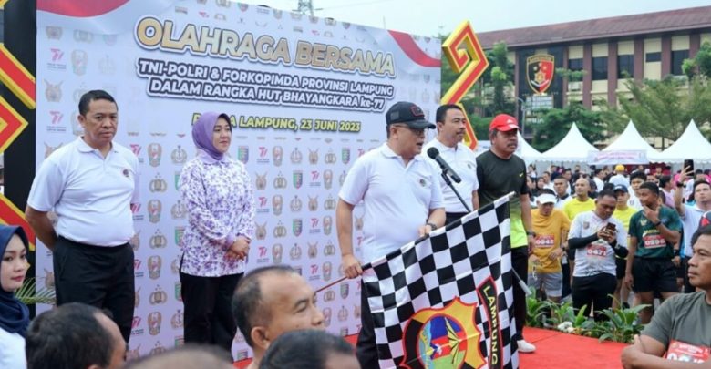 SMARTNEWS.ID – Dalam rangka memperingati HUT ke-77 Bayangkara, TNI-Polri dan Forkopimda Provinsi Lampung menggelar olahraga bersama, di lapangan Mapolda Lampung, Jumat, 23 Juni 2023.