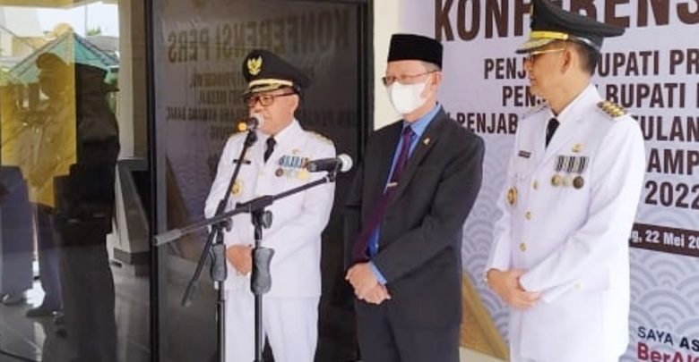 Pj Bupati Mesuji Sulpakar (kiri), saat menjawab pertanyaan awak media pada konfrensi pers yang digelar di Komplek Kantor Gubernur Lampung, Minggu (22/5/2022). ISTIMEWA