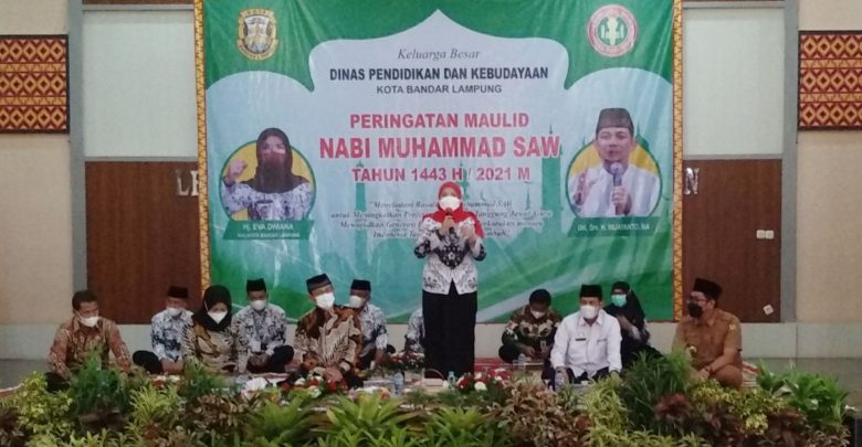 Maulid Nabi yang menjadi rangkaian memperingati Hari Ulang Tahun (HUT) ke-76 PGRI dan Hari Guru Nasional (HGN) 2021 dengan menghadirkan penceramah kondang Ustaz Wijayanto, turut dihadiri Wali Kota Bandar Lampung Eva Dwiana.