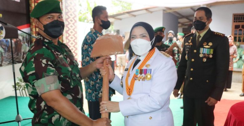 Wali Kota Bandar Lampung Eva Dwiana (dua kanan) didampingi Dandim 0410/KBL Kolonel Inf Faisol Izuddin, saat menyerahkan peralatan pertukangan kepafa personil TNI, pada pembukaan program TMMD 2022, Selasa (5/7/2022). ISTIMEWA