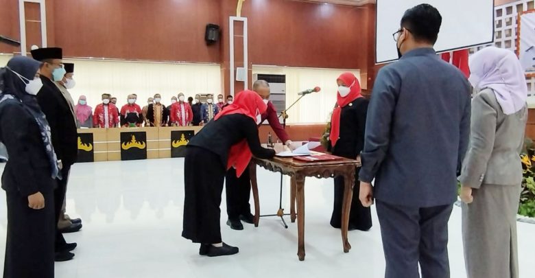 Wali Kota Bandar Lampung Eva Dwiana, menyaksikan salah satu kepala sekolah yang menandatangani SK, pada acara pengambilan sumpah jabatan dan melantik pejabat struktural dan kepala UPT sekolah, di lingkungan Pemerintah Kota Bandar Lampung, Jumat (3/6/2022). ISTIMEWA