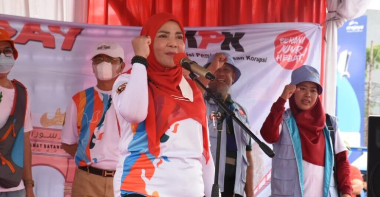 SMARTNEWS.ID – Walikota Bandar Lampng Eva Dwiana memberikan sambutan pada acara kampanye sosialisasi antikorupsi aksi masyarakat umum – digital community gathering oleh Pemkot Bandar Lampung bersama KPK RI dalam rangka roadshow bus KPK jelajah Negeri bangun antikorupsi di tugu Adipura, Minggu (25/09/2022).