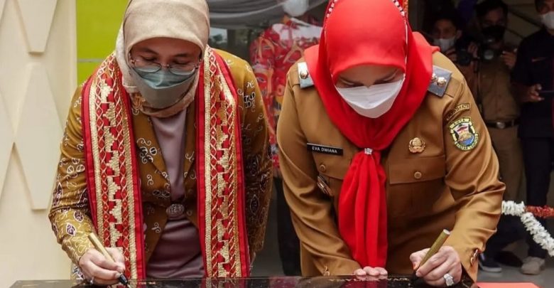 SMARTNEWS.ID – Walikota Bandar Lampung, Eva Dwiana bersama Direktur Jenderal Industri Kecil Menengah dan Aneka (Dirjen IKMA) Kementrian Perindustrian RI, Reni Yanita meresmikan Gedung Sentra Industri Tapis kota Bandar Lampung di Lapangan Kalpataru Kemiling, Selasa (25/10).