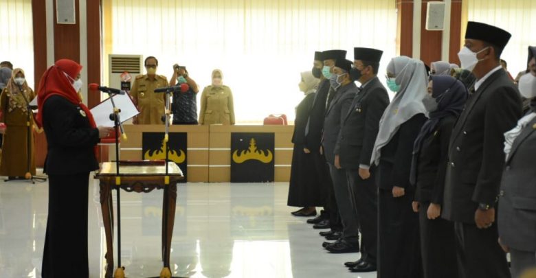Walikota Bandar Lampung Eva Dwiana memimpin pengembilan sumpah jabatan dan pelantikan pejabat struktural di lingkungan Pemkot Bandar Lampung, di Aula Semergou, Selasa (15/02/2022).