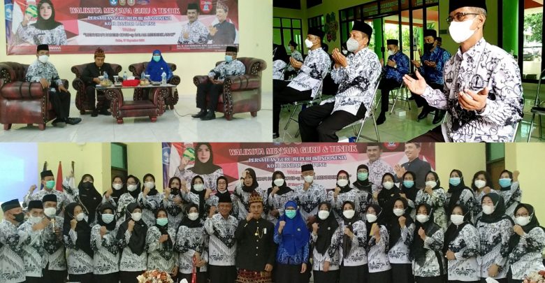 Pengurus dan anggota PGRI Kota Bandar Lampung, saat mengikuti Program Wali Kota Menyapa Guru dan Tendik, di SMPN 2 Bandar Lampung, baru-baru ini. Kegiatan tersebut bagian dari rangkaian HUT ke-76 PGRI dan HGN 2021. ISTIMEWA